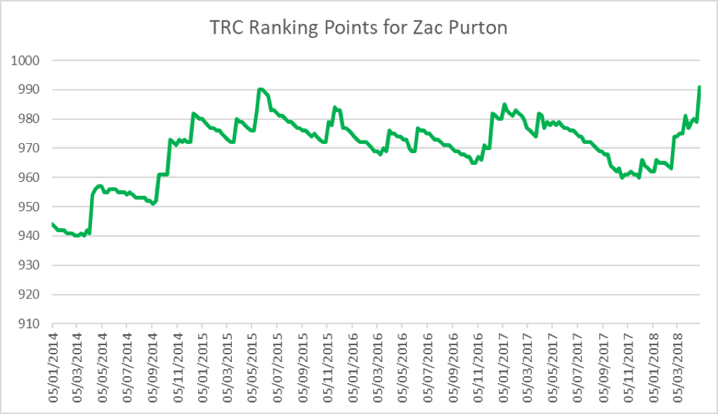 Purton is the week’s biggest points gainer (+12), which puts him up to world #17 from #23 and maintains his upward trajectory in the standings (see graph alongside).