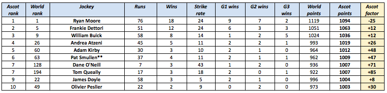 The Ascot factor - the final column on the right - is the difference between the Ascot points and the individual’s total points for all Group and Graded races in the current TRC Global Rankings.