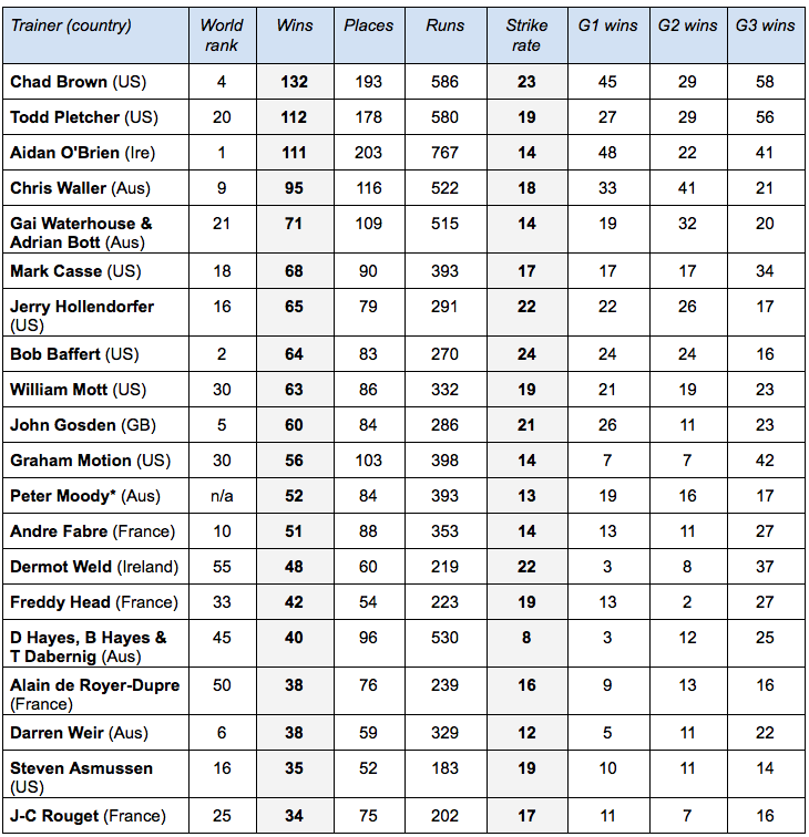 As the table below shows, the American is out on his own at the top, based on the number of Graded/Group wins in the world over the past eight seasons - the TRC Global Rankings database includes all results since the start of 2011.
