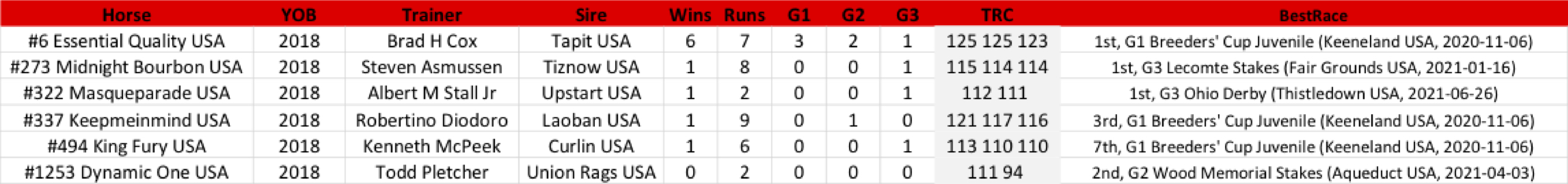 This is because Keepmeinmind has finished behind #322 Masqueperade and #494 King Fury in the G3 Ohio Derby at Thistledown and it is more consistent with all the form lines in the database (weighted by their recency) to rank these horses close to one another than it is to consider Keepmeinmind’s close second to Essential Quality evidence that he should be included among the global elite just behind the Godolphin runner.