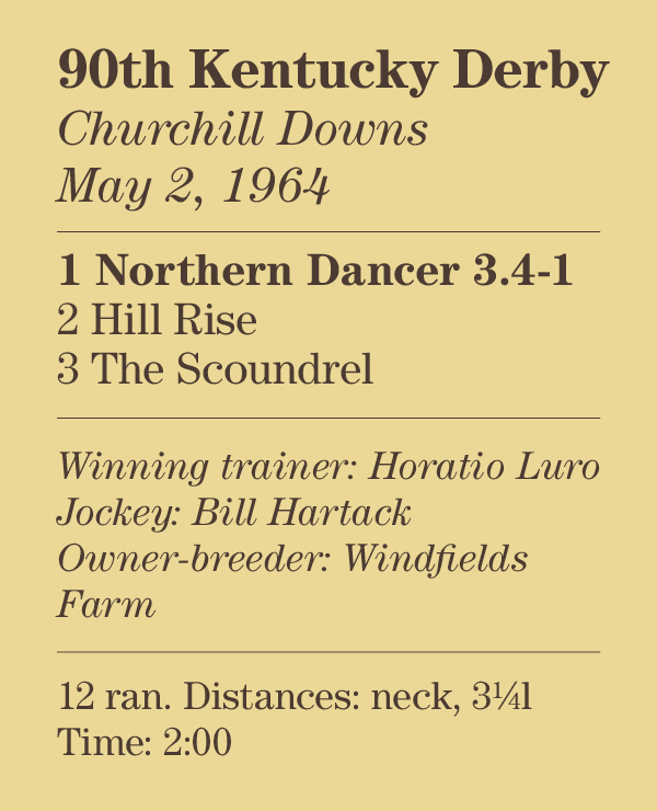 Northern Dancer sizzled through an 11-second furlong and that bought him enough daylight to get home by, for although Hill Rise relentlessly closed him down in late stretch, the favourite ran out of track. Northern Dancer won by a neck in two minutes flat, the fastest Kentucky Derby ever run to that point. He was the first horse bred in Canada to win America’s race.