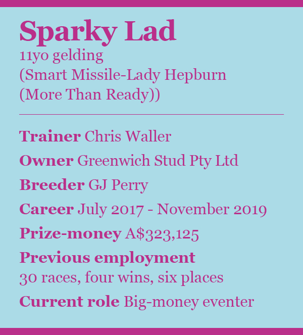 Whatever his fate in the eventing crown, Sparky Lad can already claim an association with a world champion. He and Winx, one of the greatest horses in Australian history, were stablemates in the yard of leading trainer Chris Waller and actually raced on the same day at Randwick, April 14, 2018.