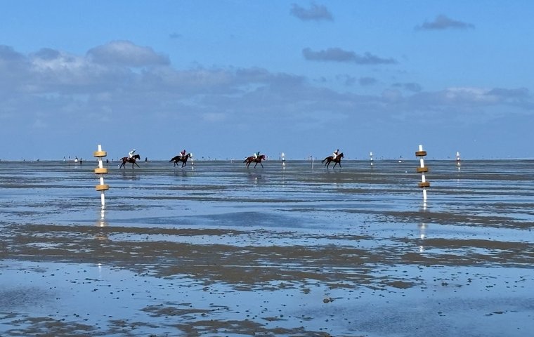 Behind a dyke stood a line of food stands. A beach of thick sand featured a sectioned-off winner’s enclosure, a VIP bar and collection of seating areas. In front of the beach, on what is often the seabed, sat a right-handed racecourse. Large poles denoted the inside of the track, while metal barriers suggested an outside rail. The tidal island of Neuwerk was included in the backdrop.
