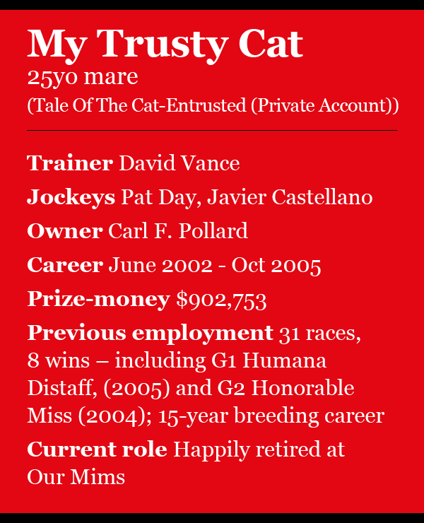My Trusty Cat retired in 2005 with more than $900,000 in earnings before commencing a 15-year breeding career. She produced nine named foals, led by Tapitry, her 2012 filly by Tapit, who finished second in the G3 Beaugay.
