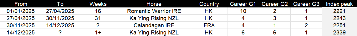 Ka Ying Rising is one of only three horses to sit at #1 in 2025, having in April succeeded compatriot Romantic Warrior (who also scored at Sha Tin in the HK Cup). The world-leading sprinter was recording his sixth G1 triumph as he defended his HK Sprint crown with ease; he now has a total of 32 weeks at the TRC summit.