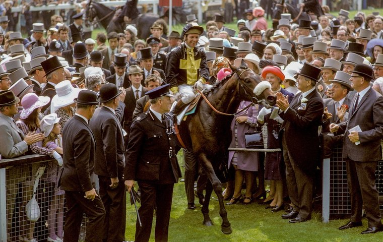 Mill Reef then went to Epsom for the Derby, moved up to a mile and a half in one bound, but had an easier time of it on the big day than did Balding, who had to run the last two miles (in top hat and tails) to the racecourse owing to a traffic snarl-up. He got there in time to saddle Mill Reef, complete with his ever-present white sheepskin noseband, and watch him cruise to a straightforward two-length victory in the hands of Geoff Lewis, who rode him in all his races.