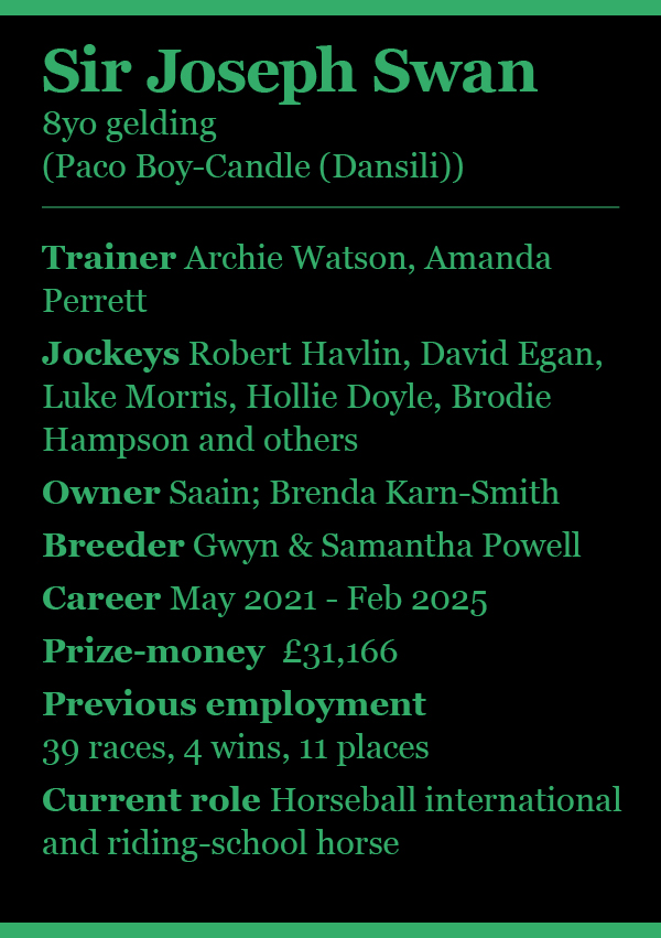 Sir Joseph Swan won four times in a four-year racing career – now he and young rider Ryan Hagger are internationals in Britain’s horseball team