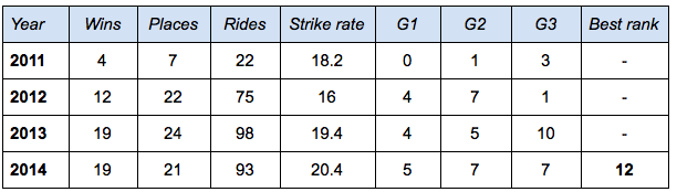 For all our data (2011-), there have been 732 riding doubles, 70 riding trebles and six four-timers. The four-timers were achieved by: